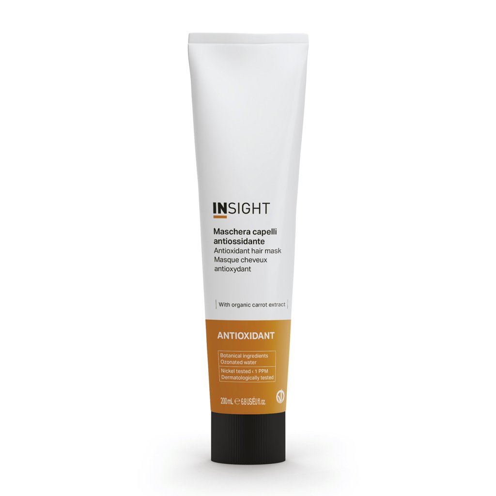 Antioxidační maska na vlasy Insight obsahuje rozjasňující, antioxidační a regenerační fytokomplex složený z organického extraktu z mrkve, sójového másla a oleje z lískových oříšků.